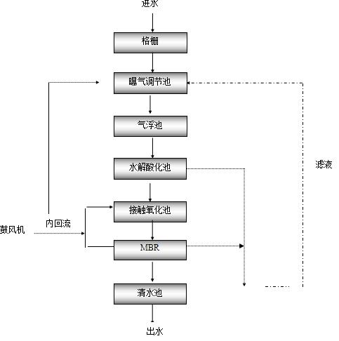項目生產廢水經過“格柵+曝氣調節池+缺氧池氣浮池+水解酸化池+接觸氧化池+MBR”綜合設備處理后,符合《城市下水道污水排放水質標準》(GB/T表1中B級標準要求后排入市政污水管網。